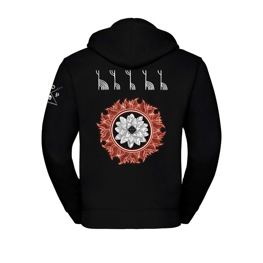 Exclusively printed Kiira 'Lovi' zipped hood jacket. White and red back print on black Russell zipped hood jacket.