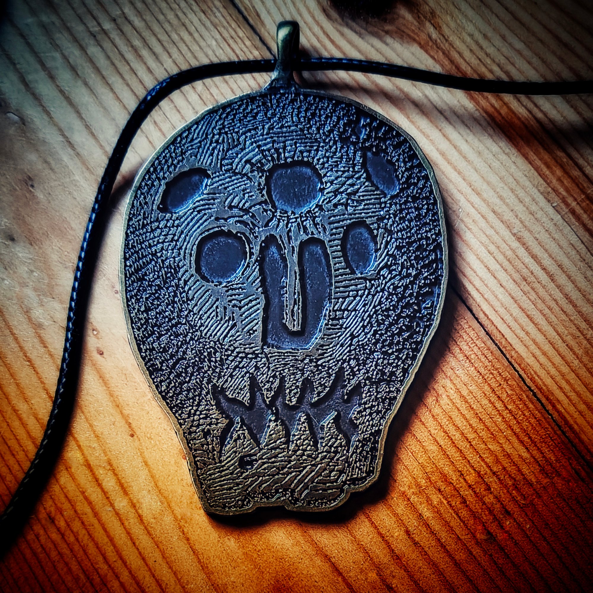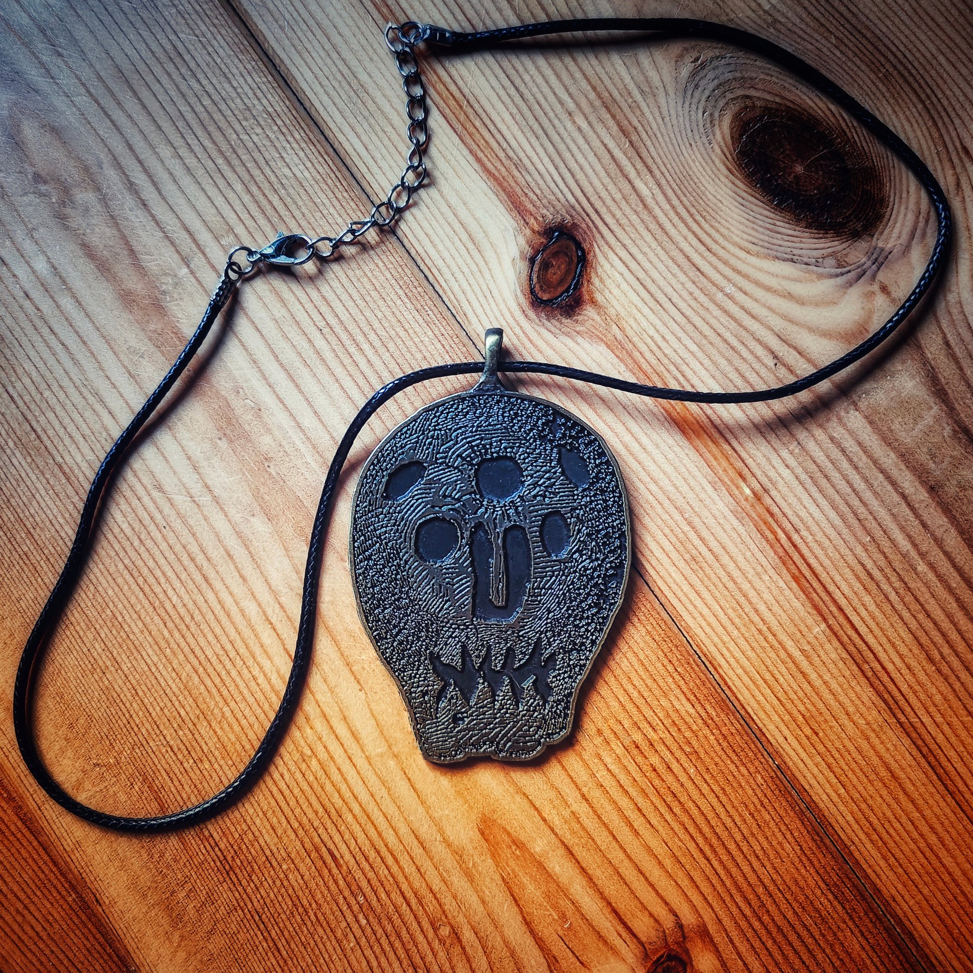 Myling metal necklace in antique bronze finish.