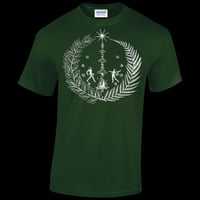 • "Sumaraz" - t-shirt. Green (Gildan Heavy Cotton Forest Green) tshirt with white print (drawing made by Leonardo Avila) illustrating some of the antinomian aspects of North European summer festivities. Green colour represents the seasonal growth of Summer and the spiritual high point of action ruled by the Sun and in extension the essence of Múspellsheimr! Each customer will have his/her t-shirt printed to the size of their own choice. Please let us know in the "notes and instructions"!